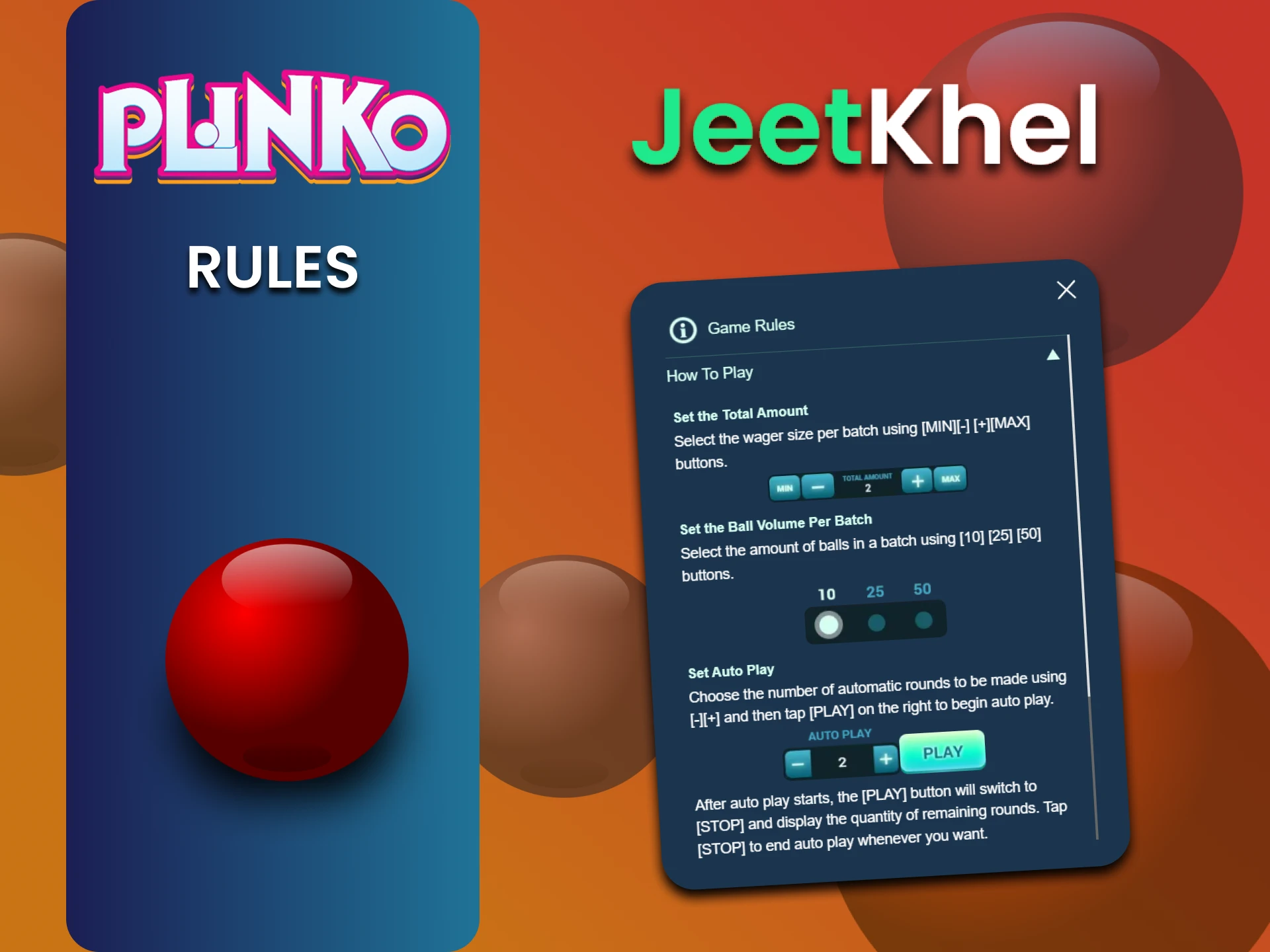 - Plinko खेलना शुरू करें। शुरू करने से पहले, विचार करें कि आप कितना पैसा जोखिम में डालना चाहते हैं। Yyou गेम के यूजर इंटरफेस से सही राशि चुनकर Jeetkhel में अपनी Plinko हिस्सेदारी को संशोधित कर सकते हैं।